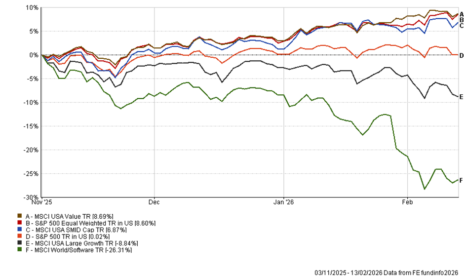 At a headline level, US equities have looked deceptively uneventful since early November. The S&P 500 is flat over that period. The chart below shows a market that has been anything but calm beneath the surface. US value, equal-weight, and small- and mid-cap indices have quietly outperformed. In contrast, US large growth has fallen meaningfully, and global software has suffered a deep drawdown. This is not a classic ‘rates up, growth down’ trade, and it does not feel like a normal cyclical rotation either. It is a repricing of both duration and competitive moats.