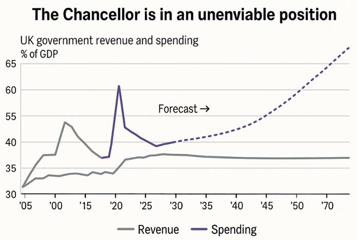 I am not a political animal, but the uncomfortable truth laid bare by the fiscal charts is that the UK’s problem is not revenue, it’s spending. Successive governments have allowed the structural cost base of the state to drift higher — driven by demographics, welfare, the NHS, pensions, and debt servicing — while hoping that incremental tax tweaks could paper over the gap. That simply doesn’t work anymore. Spending is on a steep, long-term upward trajectory; revenues are already close to their practical ceiling.
