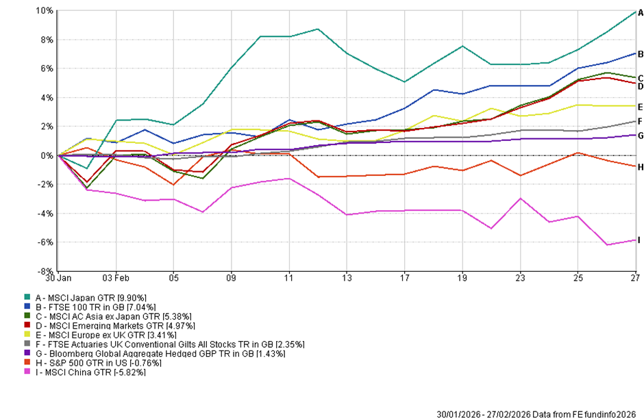 The February index performance data illustrates a notable divergence across regions. Japan has delivered the strongest returns among major developed markets, reflecting a combination of corporate reform momentum, currency dynamics and relatively attractive valuations. The FTSE 100 has also performed well, supported by its heavy weighting in energy and mining companies, both of which benefit in environments where commodity prices firm.