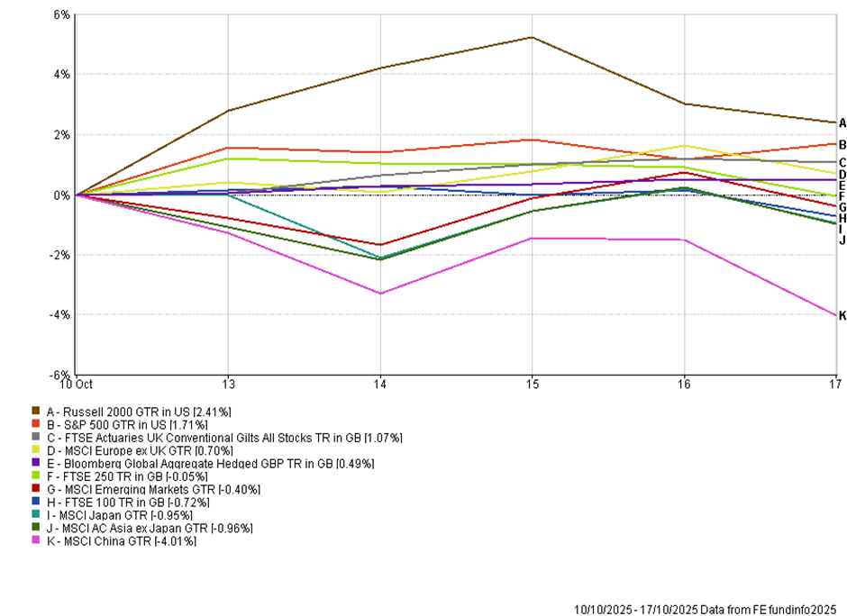 Despite the rise in nervousness, the week ended on a surprisingly positive note. US equities finished higher, supported by a strong start to the third-quarter earnings season, particularly among the large banks where investment-banking revenues have rebounded. Fixed income markets also firmed, with US Treasuries and gilts both advancing as yields edged lower. The 10-year US Treasury yield briefly slipped below 4%, while UK gilts rallied in anticipation of further Bank of England easing later this year. The combination of steady earnings and softer yields helped restore confidence after what began as a jittery week.