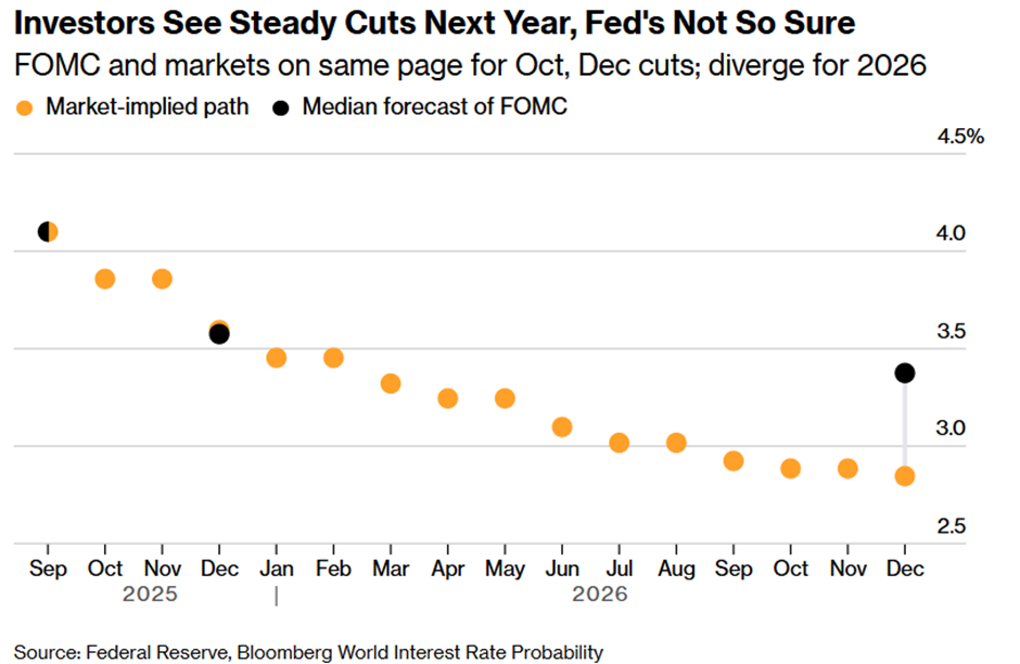 Markets, for once, are aligned with the central bank for this year, although they may go their separate ways next year. Futures are pricing two further cuts this year in October and December, though Powell himself stopped short of validating that trajectory. The message from policymakers remains nuanced: inflation is easing but still above target, growth has cooled but not collapsed, and the ongoing government shutdown has left the data flow patchy at best. Within that fog, the Fed’s emphasis has shifted from ‘higher for longer’ to ‘steady but responsive’.