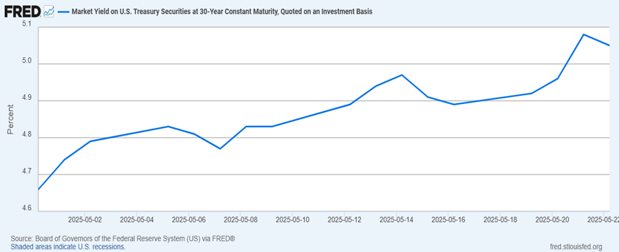 Earlier last week, markets were looking relatively stable, but that calm gave way with confirmation that Trump’s ‘Big Beautiful Bill’, a sweeping package of tax cuts, had cleared the House. While the headline wasn’t surprising, the bond market’s response was striking. A weak 20-year Treasury auction sent yields sharply higher as investors reassessed the implications of an even looser fiscal policy layered on top of an already strained debt outlook. Equities quickly followed, with rising real yields tightening financial conditions and placing renewed pressure on valuations.